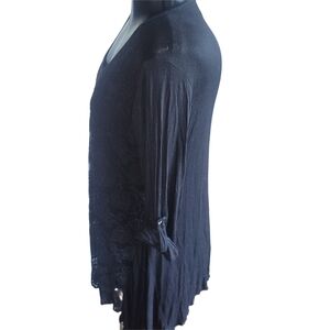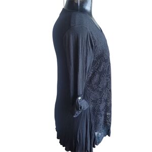 This elegant black top by Papillon is perfect for any occasion. Its intricate lace overlay design at the front adds a touch of sophistication to your wardrobe. Ideal for pairing with jeans or skirts for a chic look. Sleeves can be buttoned up shorter and hemline is asymmetrical.