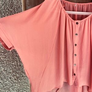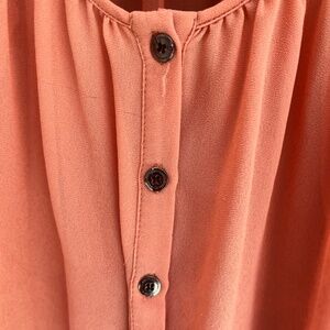 A gorgeous blouse made of delicate chiffon in ripe apricot color has a loose cut and batwing sleeves that end with cuffs on the 3/4 sleeves, a round neckline with gathers, in a country style. On the back, a single-button fastening gives individuality to the silhouette.