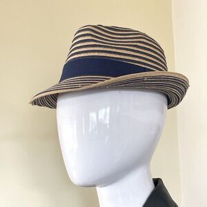 In excellent preowned condition Panama style hat made by Papillon. This "straw" hat is made from 100% recycled paper. The hat has blue and straw coloured stripes with a bigger blue ribbon circling the hat right where the headband usually is.