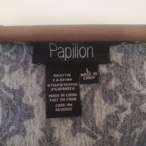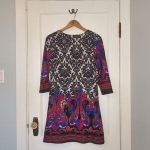 This gorgeous sweater dress by Papillon features an elegant black damask pattern set against a pale grey background at the top, and a rich crimson and indigo paisley pattern at the bottom. It has a scoop neckline and ¾ length sleeves; it’s fitted at the top and slightly flared at the bottom. You’ll feel beautiful wearing it as a dress, or with leggings on cooler days.