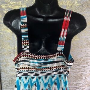 Gorgeous colour scheme of Blue, Red Black and White with flecks of Lime Green,This Dress has stretch.sleeveless,deep V-neck, elastic back and elastic waistband. Dress is light and flowy. A fun summer dress.Be chic and stylish all summer long with this gorgeous and flowy, easy breezy maxi dress!