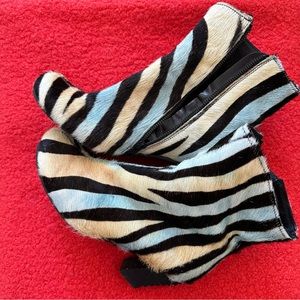 Unique zebra pattern and fur texture, size 38 ankle boot. Gorgeous curved stacked heel.