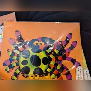 An innovative greeting card, this die-cut spider mobile is dressed up in furry flocking and connected with light chain suspensions so it can be hung in a doorway, ceiling, or stairway.