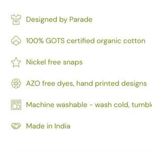 You can rest assured each Parade piece was grown, dyed, and sewn under GOTS standards. This label ensures the organic status of textiles, free from chemicals, from the harvesting of raw materials through environmentally and socially responsible manufacturing.