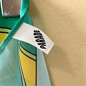 Bright pop art fun, this silky “parade” scarf is perfect for Summer. Measures 24 x 24”. In very good condition, laundered and ready to wear.