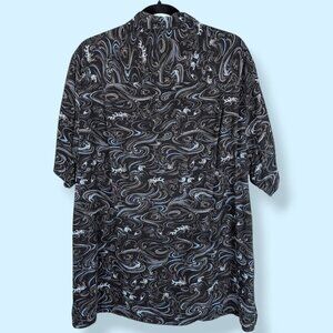 This buttoned shirt by Paradise Collection is made of 100% silk and features a dark swirly wave graphic in black, grey, brown, blue, and white. The shirt has short sleeves, a collar and button front, and a pocket on the left chest. The fabric is lightweight and perfect for humid days. There is normal wear, but no issues affecting wearability.