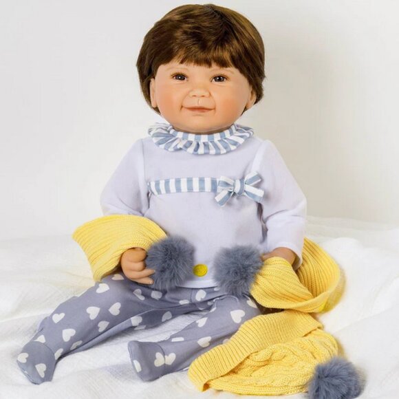 Comes with a long sleeve velour white shirt with bottom embroidery, gray leg warmer footed pants with custom heart imprint, butter yellow knit cap with silver-gray faux fur pompom, and a matching scarf.