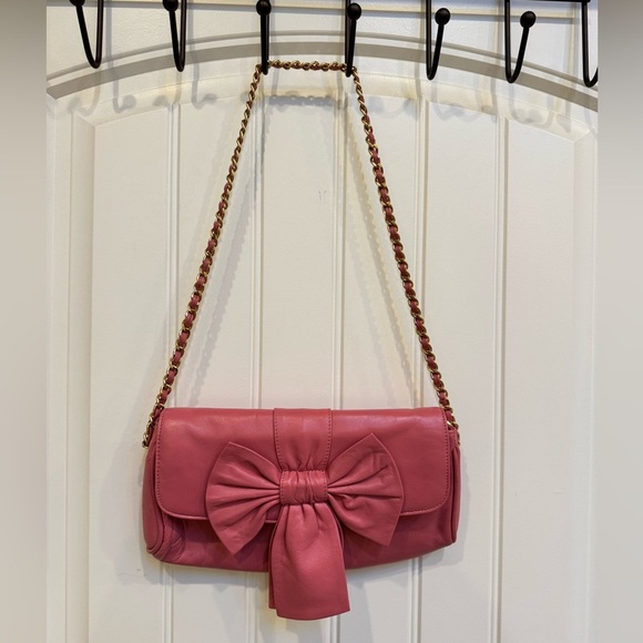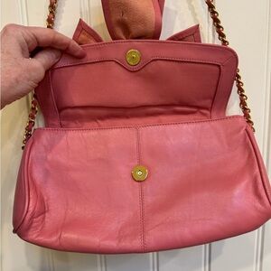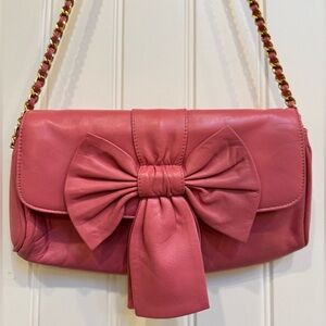 Paradox Pink Leather Bow Shoulder Purse. 10” by 6” by 0.5” with strap drop 13”