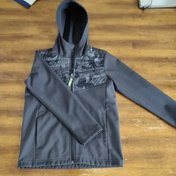 Great Condition Boys L (10/12) Softshell Jacket Black with Black camo panels on front. 2 Front pockets