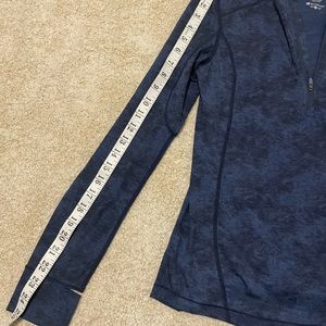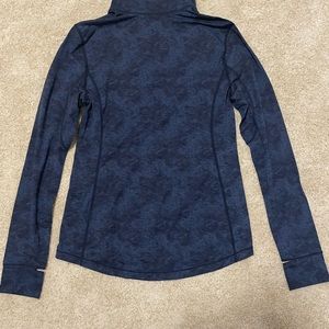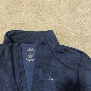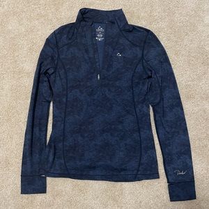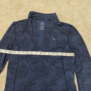 Quarter zip in the front has zipper cover to keep in place as you move, neckline offers additional coverage.