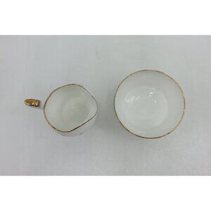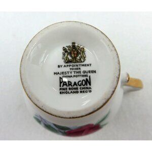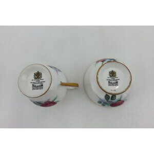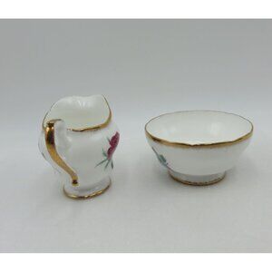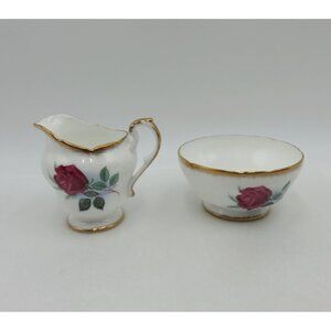 This elegant Paragon creamer and sugar bowl set is crafted from fine bone china and adorned with a classic rose pattern.