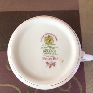 This is a coffee tea mug made in England by Paragon in the Prairie Rose pattern- one of the Canadian Provincial Flowers series. This is the Alberta provincial flower(more commonly known as the Wild Rose). A vibrant display of the Pink Wild Rose adorns the mug. The mug is in very good vintage condition with no chips, cracks or crazing. There is minimal fading on the gold gilt trim.