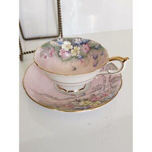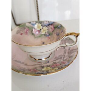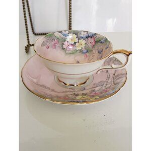 Paragon Tea Cup and Saucer Set Pink Floral Landscape with Birch Trees 1940's