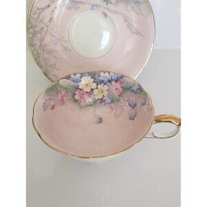 Paragon Wide Mouth Tea Cup and Saucer Set Pink Floral Landscape with Birch Trees Fine Bone China Double Warrant