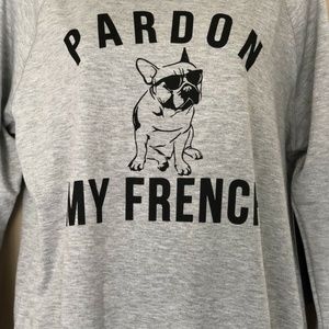 Ladies long-sleeve t-shirt weigh sweatshirt top. Grey, brand new with tags "PARDON MY FRENCH" top with Frenchie dog image. SO soft and comfy with roomy fit. You will love lounging in this! Medium or large available !
