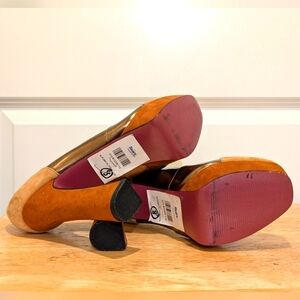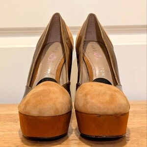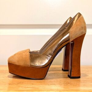 Paris Hilton 8 70s Inspired Suede Platform Pumps in Tan Gold Brown and Plum