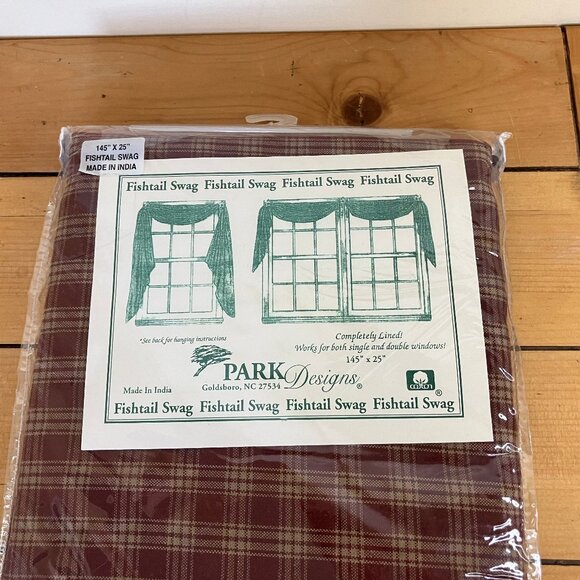 New in package Park Designs fishtail swag curtain is in a classic plaid check pattern in burgandy & tan. Cotton curtain is fully lined, made in India, 145" long x 25" wide.