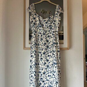 - Fitted sweetheart bodice, flutter sleeve, lined, midi length, fitted skirt