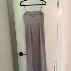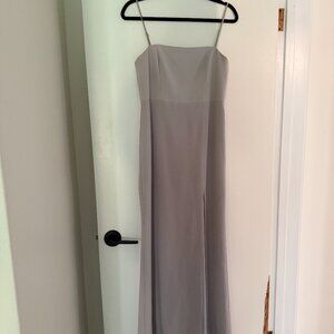 Elegant dove grey maxi dress. Features a sleek design with a high slit. Perfect for formal occasions.