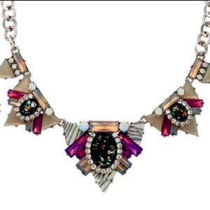 Gorgeous statement necklace , Center stones reflect, greens, yellow, surrounded by Austrian crystals, shades of amethyst, topaz and mother of pearl, 18”+3”