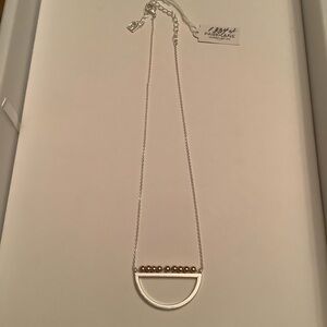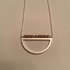 Mixed metals combine in this playfully artistic necklace. Floating gold tone beads sit above a half circle in matte Silver. Attached to a fine silver chain.