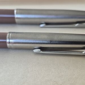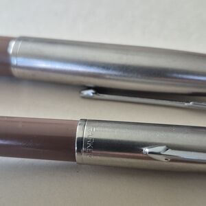 vintage parker cocoa and silver fountain pen and pencil set with a sleek design.Aerometric filling. pens size 5-1/2 inches . I belive to be made in 1948. set is in amazing vintage condition. This will make a wonderful gift or to add to your luxury collection