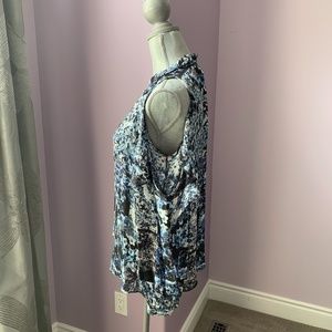 Neckline keyhole with tie closure. Open shoulders with ruffle trim. Button cuffed sleeves.