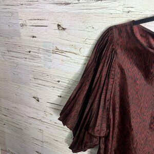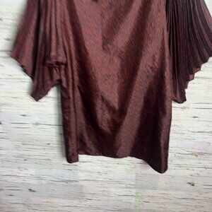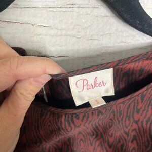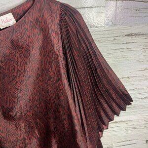 This stunning mini dress by Parker showcases a bold red and black color palette, complemented by elegant bishop sleeves. The pleated design adds a touch of sophistication, making it perfect for any special occasion.