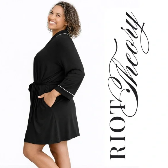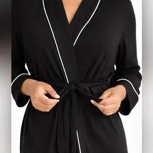 Soft and comfortable black lounge robe featuring elegant white piping along the collar, cuffs, and hem. Designed with a relaxed silhouette and adjustable tie waist, making it perfect for cozy mornings, lounging at home, or winding down in the evening.