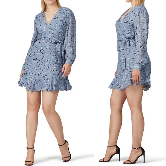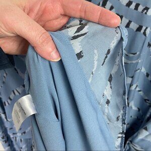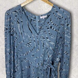 Parker Soliana Silk Blue Print Ruffle Dress in Women's Size 18. Print is called Arctic Tiger. Has surplice front, left side tie (faux wrap) and button cuffs. 53% silk and 47% viscose. Lined. Back zipper closure. Made in China. Dry clean. Retails for $318 USD (approximately $442 CAD). Very good pre-loved condition. No visible flaws.