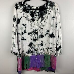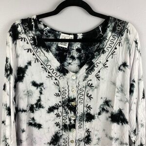 Parsley & Sage Black White Tie Dye Multi Colour Hem Embroidered Button Down XL