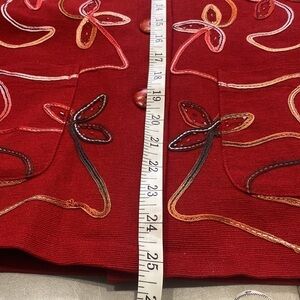 Deep red button up blazer with threaded beaded flowing design. The design cover the front and back and circles around the cuffs. Buttons are well secured and have a rustic look. Two open pockets.
