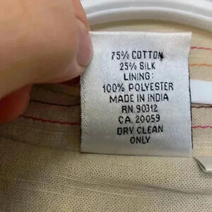 The fabric is crisp and will hold it shape well. This is dry, clean only and has a bit of two-way stretch. This is light enough to layer and heavy enough to wear on its own.