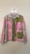 It’s a beautiful patchwork piece with muted tan, shimmery green and pink with white leaves. The white leaves are sewn on, and the red flowers are stitched on. The different fabrics are affixed to the jacket with see-through stitching. The jacket is fully lined in a soft green polyester.