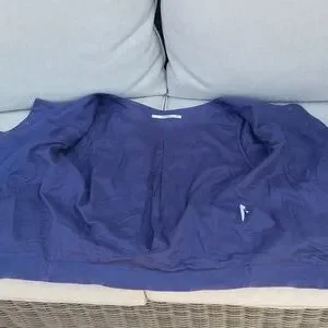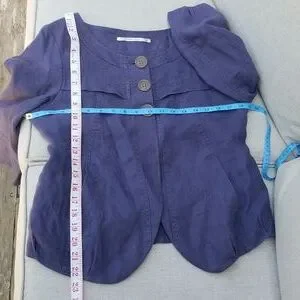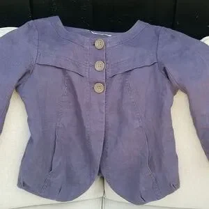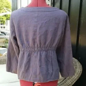 This little mulberry gem is a perfect addition to your linen / flax collection ( obsession😁). 100 % linen and fully lined bodice. Side pockets and 3 button closure with a rounded front hem. Elastic gathering along back. Dart / pleat detail at hemline and wrist.