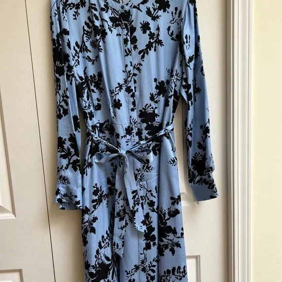 Blue with black floral pattern. Scoop neck. Buttons at neck and sleeve. Tie waist. Pockets. Just below knee.