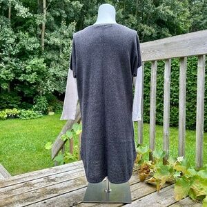 Part Two grey tunic, size small. Wide neckline. Dropped shoulder, 3/4 sleeve. Chest pocket. Rounded hems. Stretch lightweight fabric; 60% linen, 26% cotton, 14% polyester.