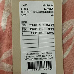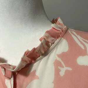 New. Blush pink with creamy white floral pattern. Full button down. Ruffled collar. Dolman style sleeves. Loose fit style. Slightly sheer.