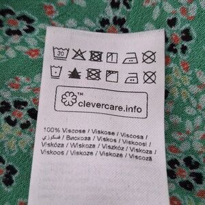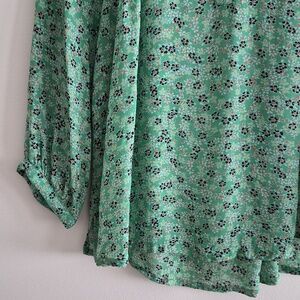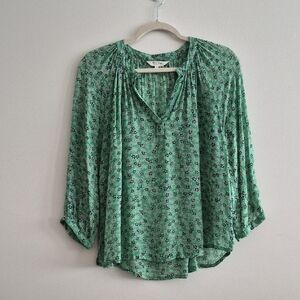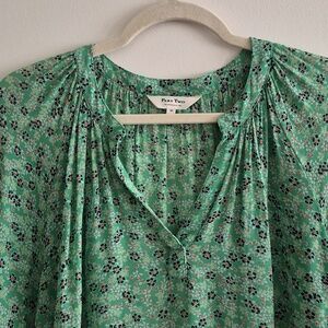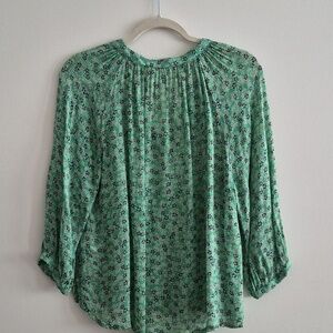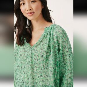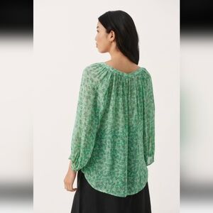 Pretty floral green blouse with smocking around the neckline. It is a high/low style and has side splits. 100% viscose. Danish boutique brand. Pit to pit is approximately 23.5" and length is 23.5" in the front and 24.5" in the back. Gently worn.