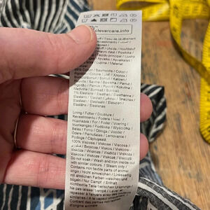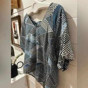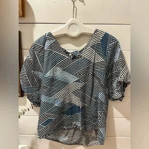Chic lightweight top from Part Two Copenhagen, featuring a navy blue and white abstract geometric print. Short puff sleeves, elasticated waist, and a tie detail at the back. Comfortable and easy to style. Size 36 (equivalent to Small).