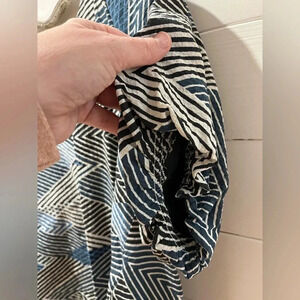Haut léger et élégant de Part Two Copenhagen, avec imprimé géométrique abstrait bleu marine et blanc. Manches courtes bouffantes, taille élastiquée et détail de nœud au dos. Confortable et facile à porter. Taille 36 (équivalent Petit).