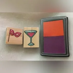 Fun stamp set featuring a mask and cocktail glass. Includes vibrant orange and purple ink pad.