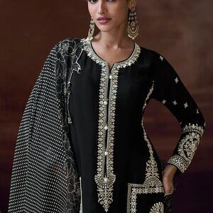 Party Wear Chinnon Silk Black Embroidered Pakistani Style Palazzo Suit