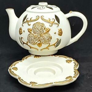 PartyLite Cream Bisque Rose Gold Teapot Votive Candle Holder-Vintage (approx. before 2000). EUC with no signs of chips, cracks or scratches. Approx. size: 7" (w); 6" (l) x 5.5" (h). Beautiful vintage tealight/votive candle holder shaped like a teapot sitting on a saucer. Wonderful cream coloured bisque material with gold trimmed roses & accents. This unique candle holder looks amazing when a candle is lit on inside & it's design makes it perfect for any home/office. A real conversation starter!