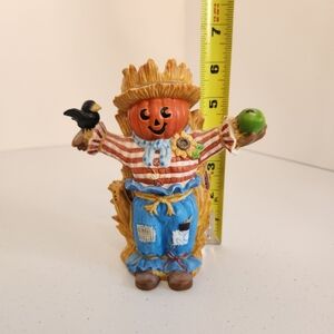 Super cute Jack-o-lantern Scarecrow holding a crow and apple