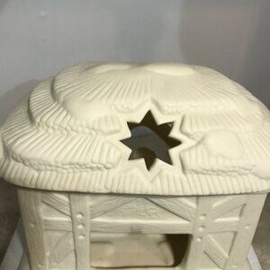 This Partylite porcelain tealight holder beautifully depicts a nativity scene, providing an elegant and serene ambiance when lit. The intricate design and soft glow from the candle create a warm, inviting atmosphere, making it a timeless addition to holiday decor.