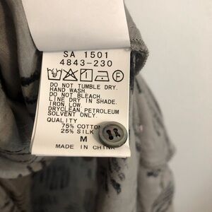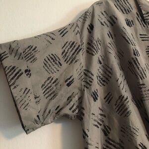 This Pas De Calais Women's Dress in size M is perfect for any occasion, from formal weddings to casual outings. The dress features a gray geometric pattern, cap sleeves, a collared neckline, and a pullover closure. It is made of a lightweight blend of silk and cotton, making it comfortable to wear all day long. The dress also includes pleated accents, button detailing, and a drop waist for a unique touch. The midi length and blouson style add to the dress's versatility. It is recommended to hand wash only. This dress is perfect for those looking for a stylish and comfortable option for any event.