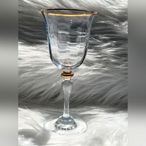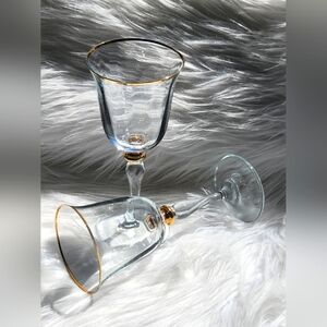 Set of four elegant wine glasses with gold rims. Perfect for special occasions.