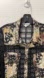 Statement top with earthy abstract print, black mesh panels, and button closure.