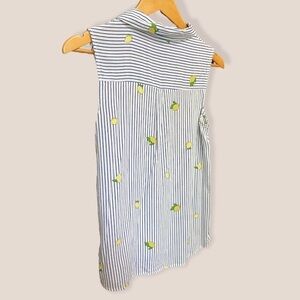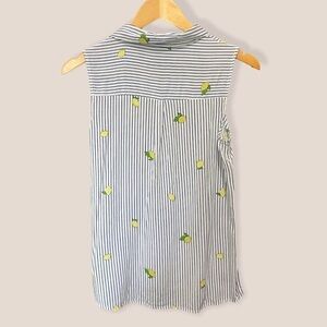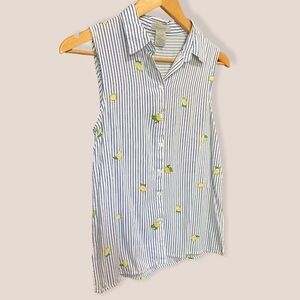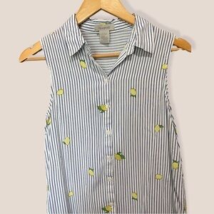 Adorable sleeveless button down top with striped and lemon pattern. Some minor signs of wear, in overall good condition. 100% rayon. Size S.